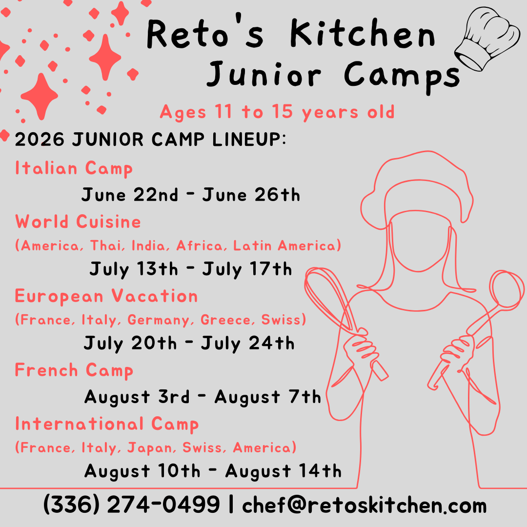 Each year, Chef Reto welcomes students from the Triad, to his yearly Junior Chef Summer Cooking Camps. Students spend a week learning basic kitchen skills, how to cook food from all around the world, and the links between food, culture and sustainability.