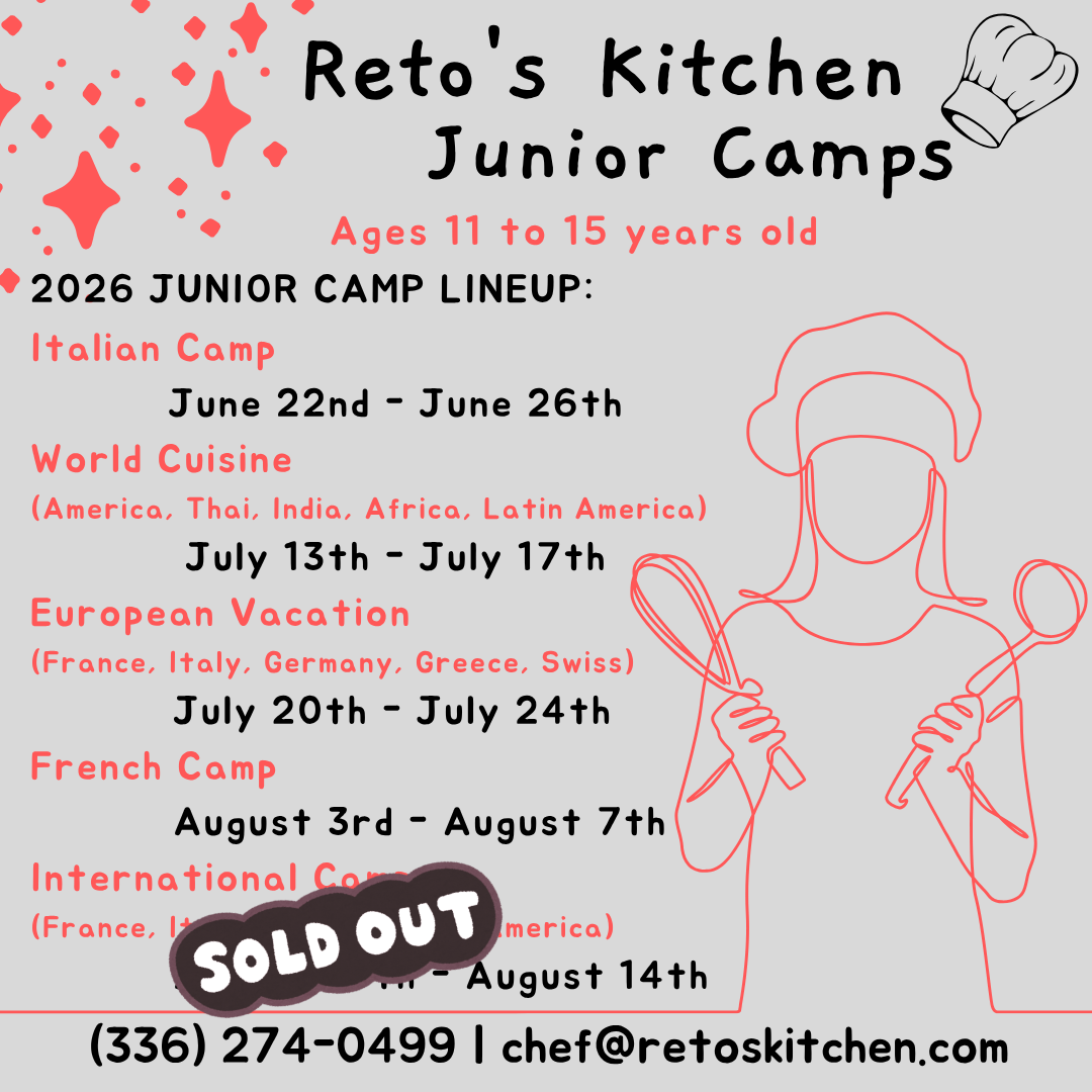 Each year, Chef Reto welcomes students from the Triad, to his yearly Junior Chef Summer Cooking Camps. Students spend a week learning basic kitchen skills, how to cook food from all around the world, and the links between food, culture and sustainability.